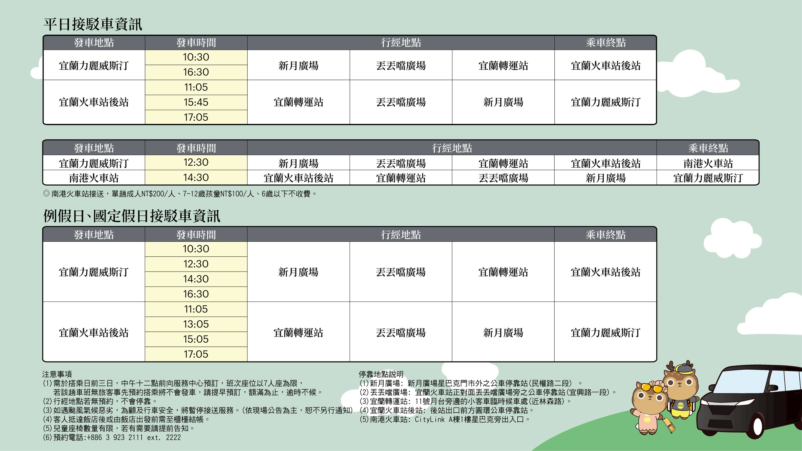 南港車站接送貴賓,單趟成人NT$200/人、7-12歲孩童NT$100/人、6歲以下不收費,須來電預約。