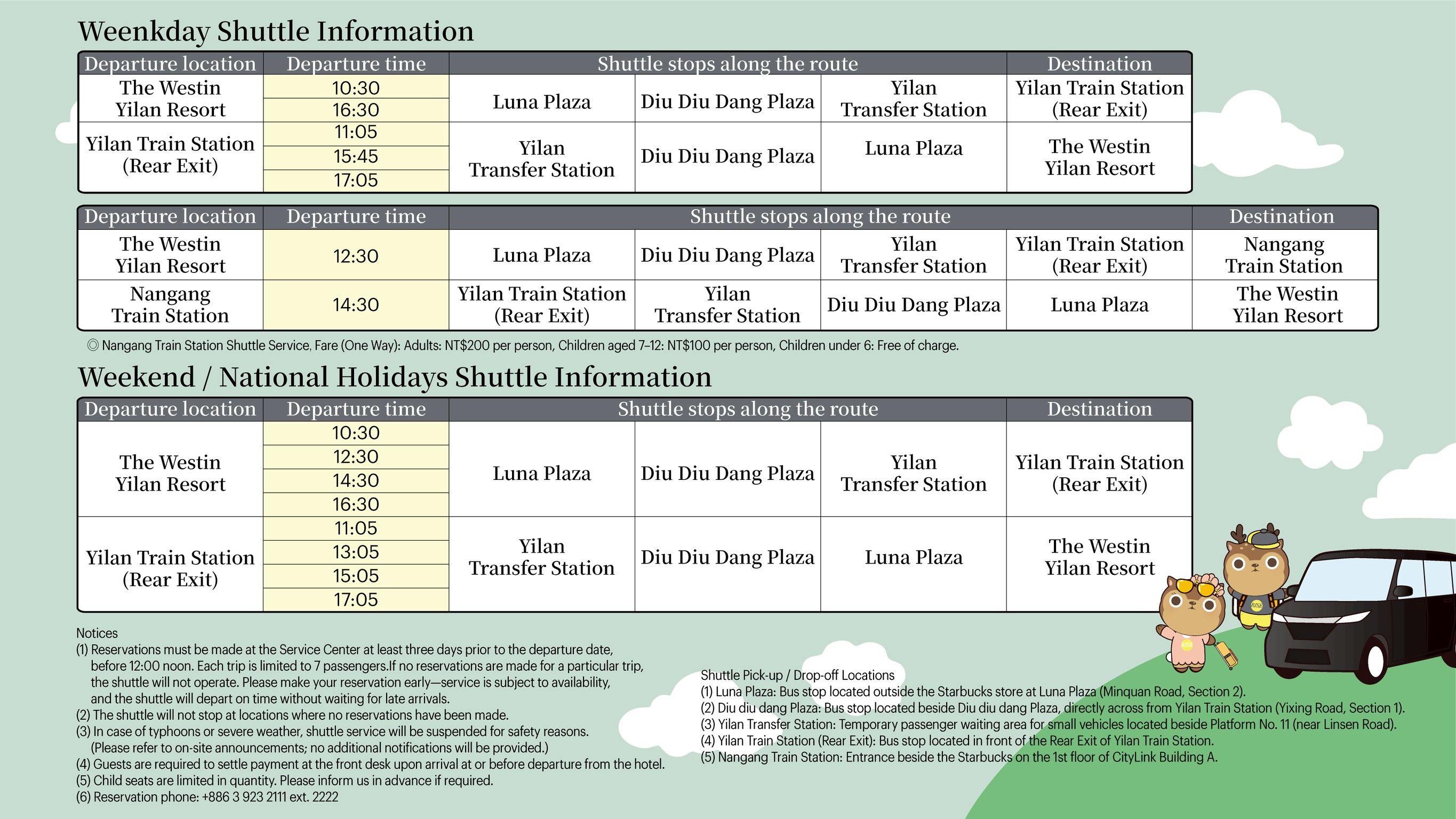威斯汀接駁專車提供入住房客宜蘭火車站與宜蘭轉運站至酒店的免費搭乘。