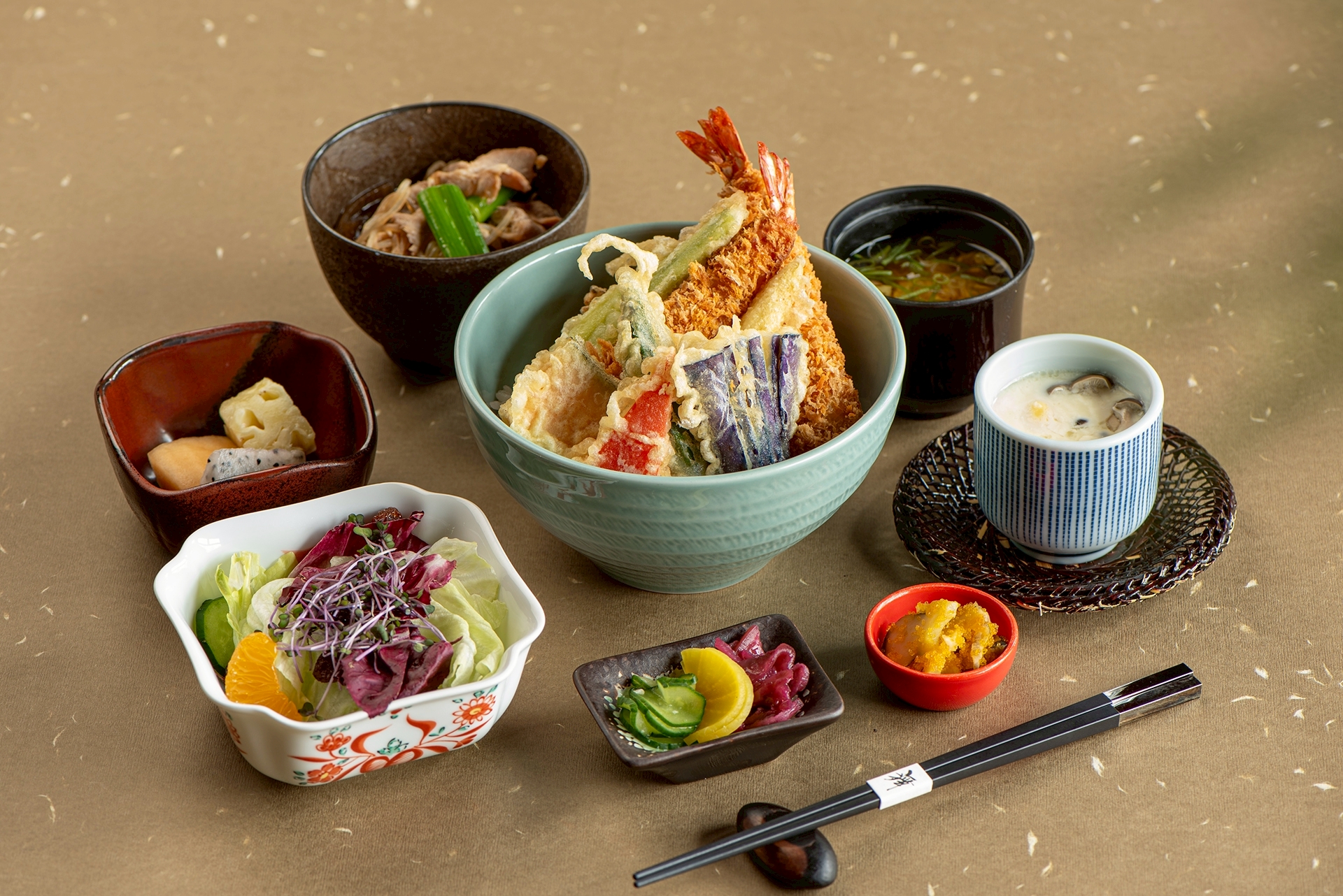 嚴選鮮甜海味與季節時蔬,以日式薄衣輕裹入鍋酥炸,呈現外酥輕盈、內裡鮮嫩的絕佳口感。搭配溫潤米飯與主廚特製醬汁,酥香與甘甜層層交織,帶出天婦羅最純粹的風味。佐以精選小菜與暖心湯品,成就一席經典且滿足的日式定食饗宴。