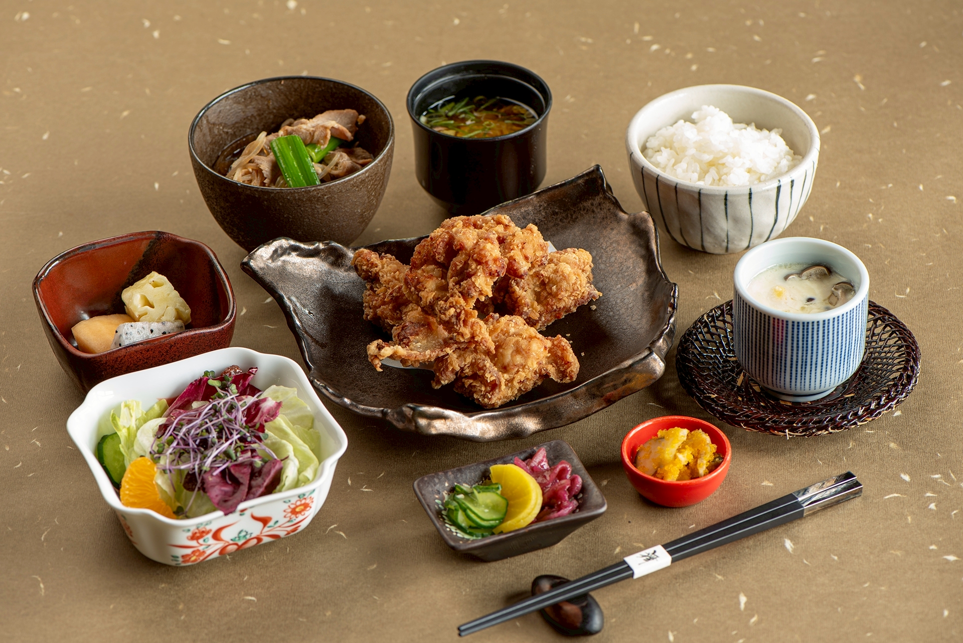 嚴選肉質紮實鮮嫩的地雞,以日式醬料細緻醃製入味,再高溫酥炸至金黃香脆。外層酥香、內裡多汁,每一口都散發濃郁雞肉鮮甜與酥脆口感。搭配米飯、精選小菜與暖湯,呈現樸實卻令人回味的日式家常定食風味。